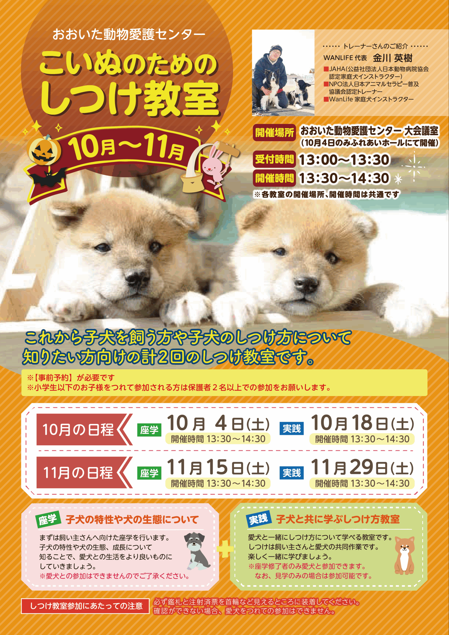 座学コースを受けていない方、これから子犬を飼おうとしている方は、見学のみとなります。 - 実践コースにワンちゃんを連れてご参加する場合、鑑札と狂犬病予防注射済票をご準備ください。