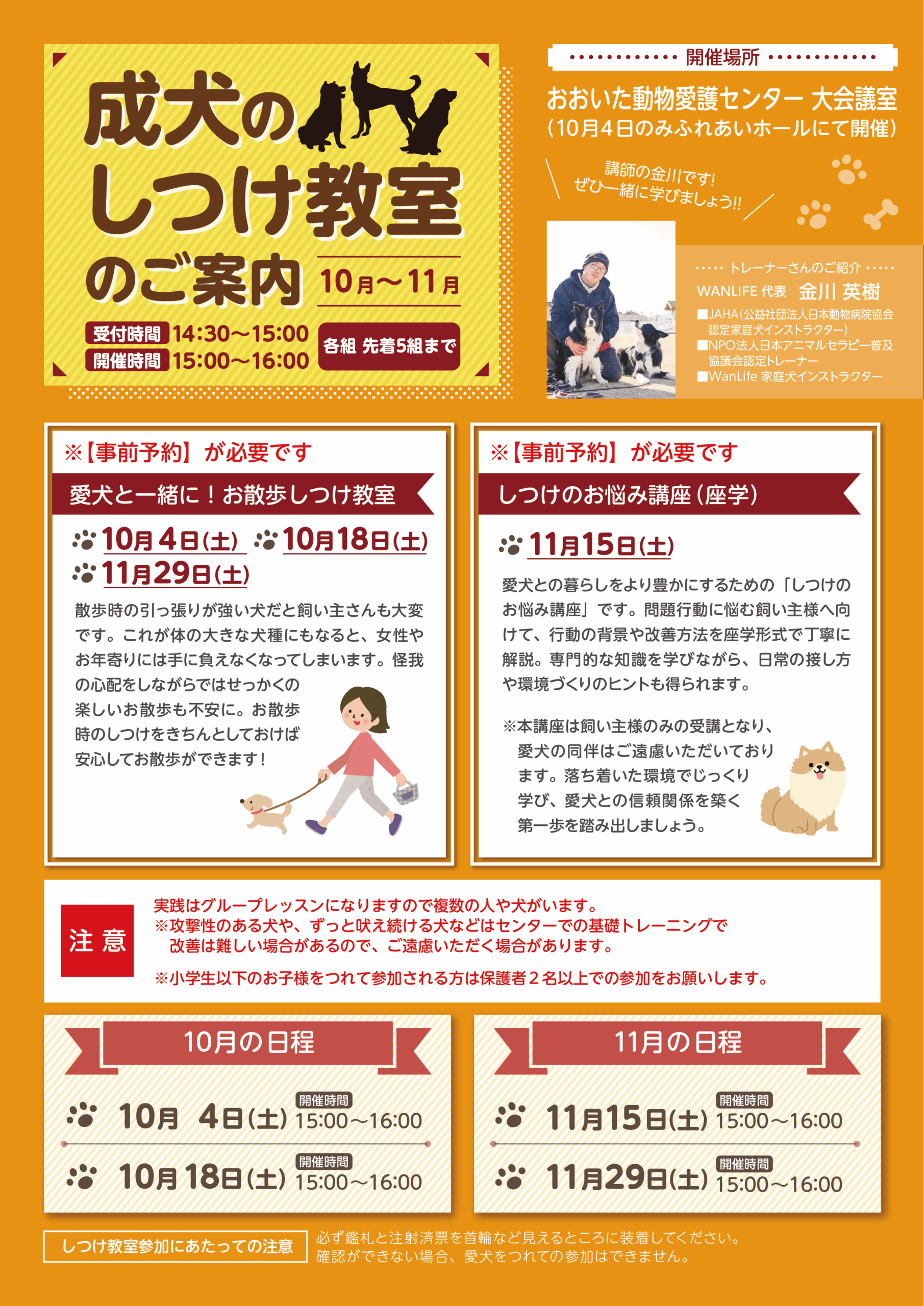 - 「感染症や皮膚病等に罹患している犬」「発情期のメス犬」「リード、首輪またはハーネスを装着していない犬」は参加(見学含む)できません。